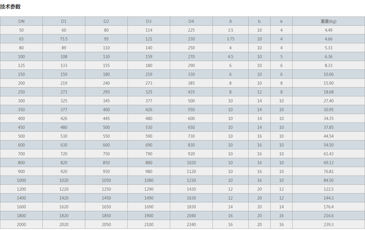 | DN | D1 | D2 | D3 | D4 | δ | b | k | 重量(kg) |