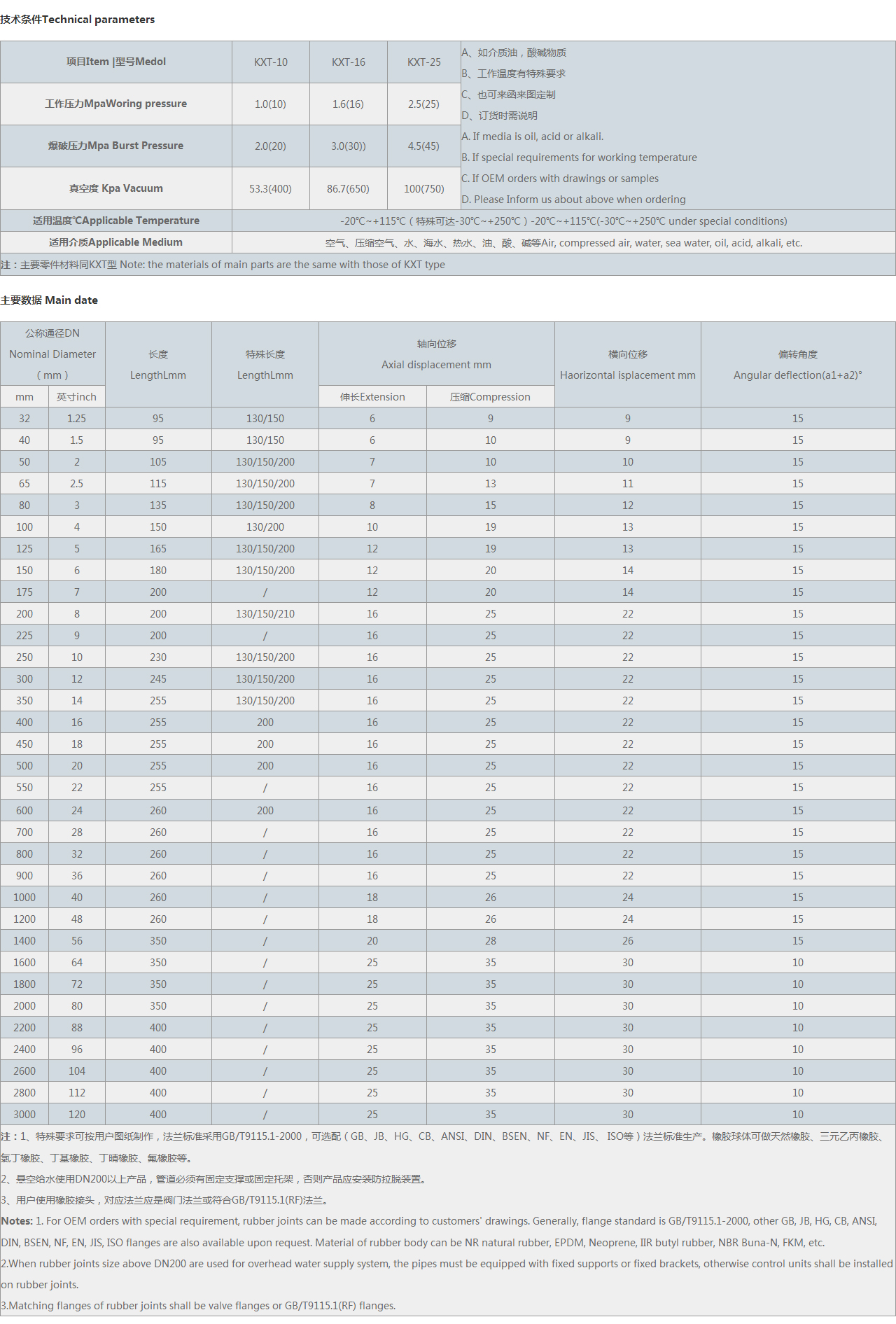 | 注:1、特殊要求可按用戶圖紙制作,可選配(GB、JB、HG、CB、ANSI、DIN、BSEN、NF、EN、JIS、 等)法蘭標準生產。橡膠球體可做天然橡膠、三元乙丙橡膠、氯丁橡膠、丁基橡膠、丁晴橡膠、氟橡膠等。 2、懸空給水使用DN200以上產品,管道必須有固定支撐或固定托架,否則產品應安裝防拉脫裝置。 3、用戶使用橡膠接頭,對應法蘭應是閥門法蘭。 Notes: 1. For OEM orders with special requirement, rubber joints can be made according to customers' drawings. Generally, flange standard is , other GB, JB, HG, CB, ANSI, DIN, BSEN, NF, EN, JIS, flanges are also available upon request. Material of rubber body can be NR natural rubber, EPDM, Neoprene, IIR butyl rubber, NBR Buna-N, FKM, etc. 2.When rubber joints size above DN200 are used for overhead water supply system, the pipes must be equipped with fixed supports or fixed brackets, otherwise control units shall be installed on rubber joints. 3.Matching flanges of rubber joints shall be valve flanges or flanges. |